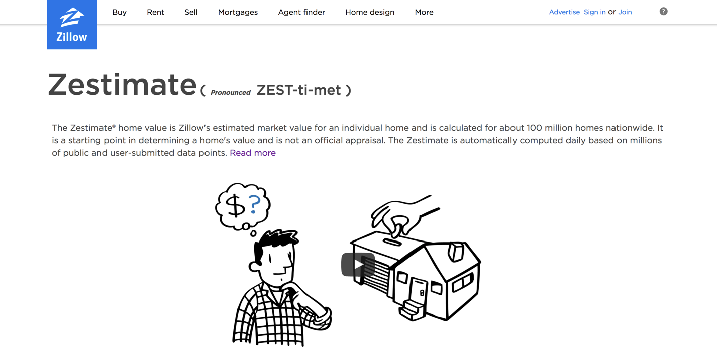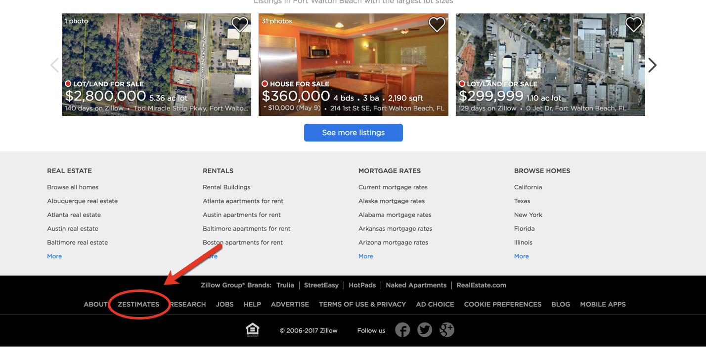 Zillow doesn't make it easy to track down "Zestimates" on their website. Sure you can easily get a "Zestimate" by clicking the box right in the middle of the home screen, but what if you had a question or wanted to learn more. This is where it gets tricky.